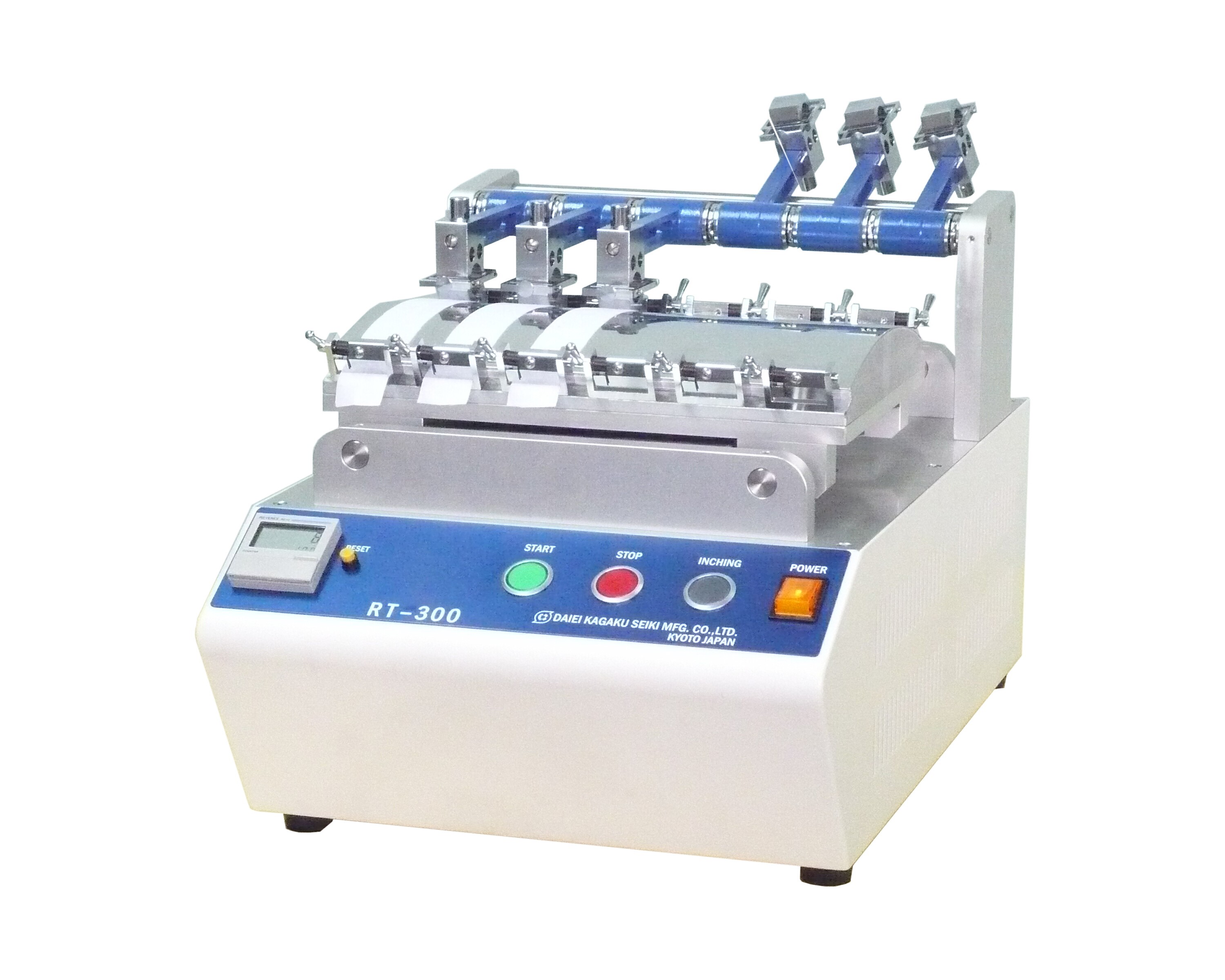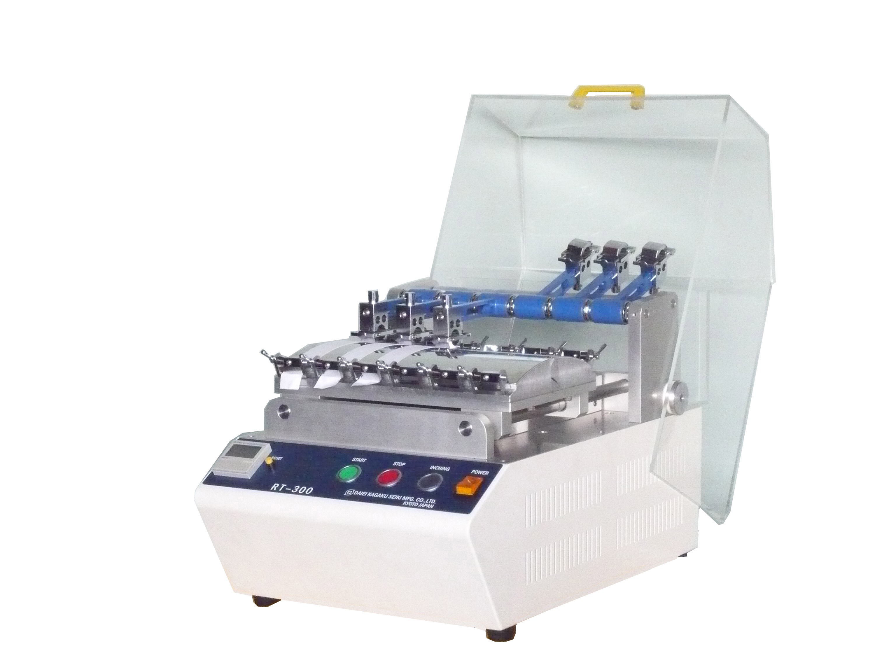 本机是以日本工业标准〖纺织品色牢度试验方法〗中的『耐摩擦色牢度试验方法』(JIS L 0849 )中规定的摩擦试验机Ⅱ形(学振形)为标准的试验机。主要用于染色纤维制品的耐摩擦色牢度的评价和判定。通过对各种别卖附属部品的交换,可适用于植绒加工布料的「植绒强度试验」,人造革的「摩擦脱色试验」,纸板、印刷油墨、涂料等的「耐摩擦、摩耗试验」等。可适用于多种素材的耐摩擦试验机。